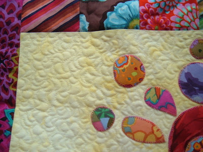 Hurray! I managed to do some quilting in between the business of the past weekend. I used YLI silk thread to do this background quilting and it is lovely. It is the first time I have used silk thread for quilting and I will definitely use it again. The only real problem I encountered was getting both my top and bottom tension adjusted for the thread. It literally took me an hour to get my tension set. Hopefully, I can get the rest of this piece quilted in between the mountains of laundry I am washing today.